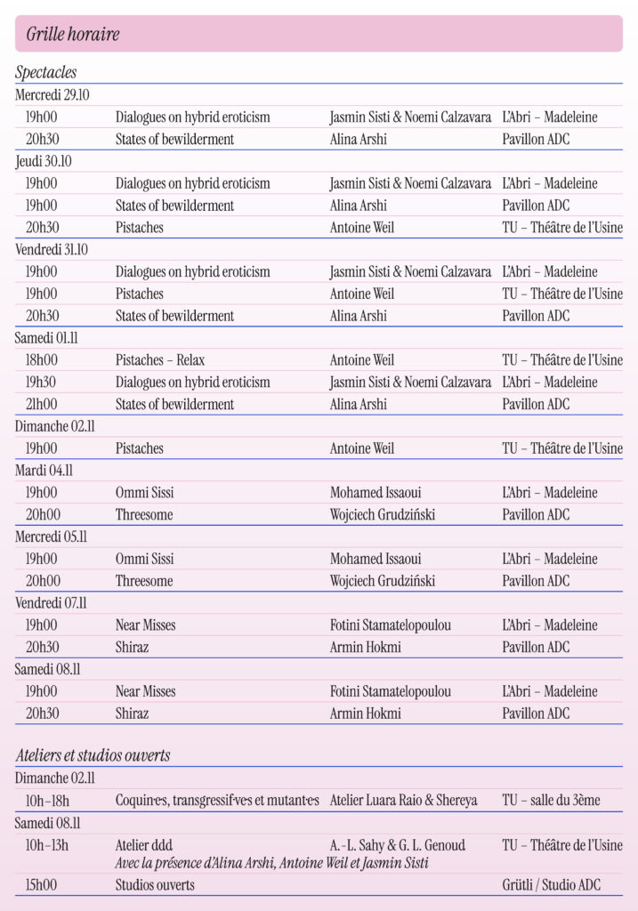 Emergentia est un temps fort consacré à la relève chorégraphique qui a lieu chaque automne. La plateforme est née en 2019 de la collaboration entre trois institutions genevoises – L’Abri, le Pavillon ADC et le TU – Théâtre de l’Usine.